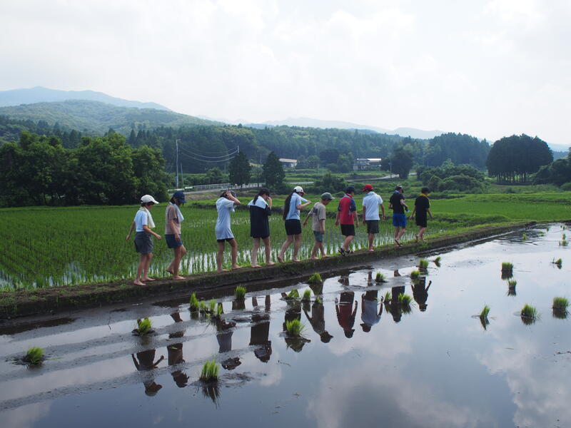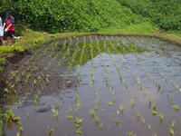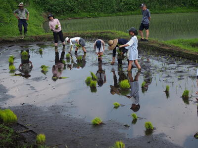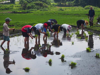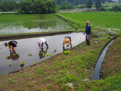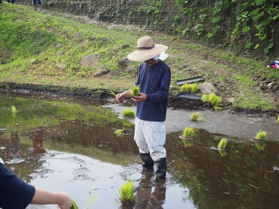 6月の初旬に予定していた田植えですが、雨で延期、延期・・・今日も雨なら体験中止にしていたけれど、ようやく晴れて田植えをすることができました。真木地区の吉良さんにお世話になり、5・6年生が田んぼに入ります。