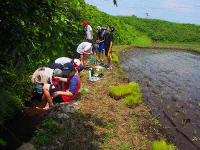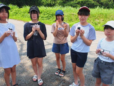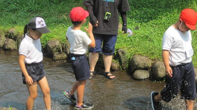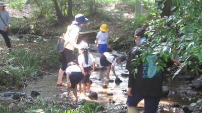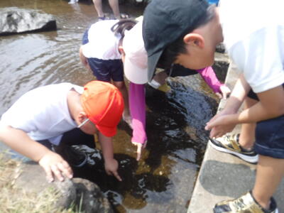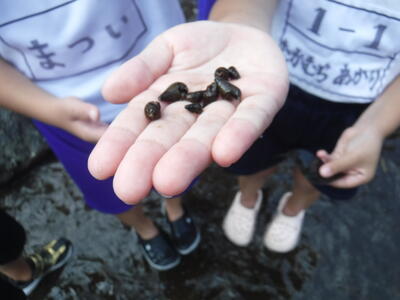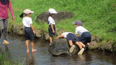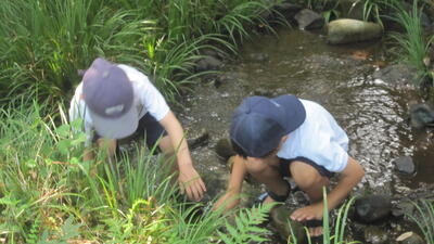 「プールの水より冷たい!」「気持ちいい」「カニがおる!」「黄色いカエルが逃げた」生き物に遭遇して気持ちが高鳴る1~2年生。中学生ぐらいのカニを2匹捕まえて虫かごへ。タニシ(カワニナ?)を見つけた子どもも。