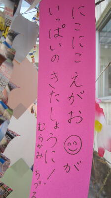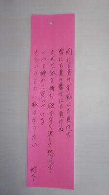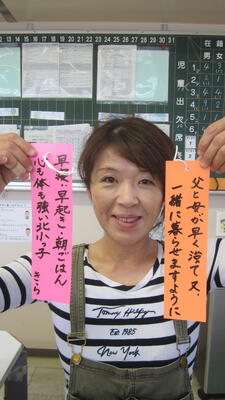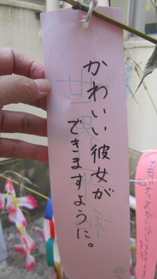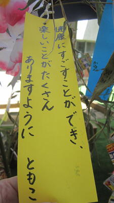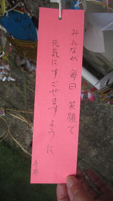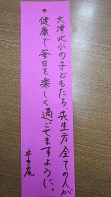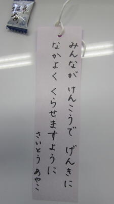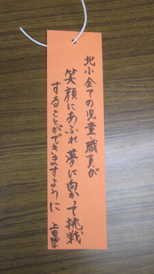 前回、載せられなかった先生方の短冊をまたご紹介します。表には一番の願い事、裏面には二番目の願い事を書いている職員もいましたので、1番か2番かはご想像にお任せします。1面しか撮影しておりません。