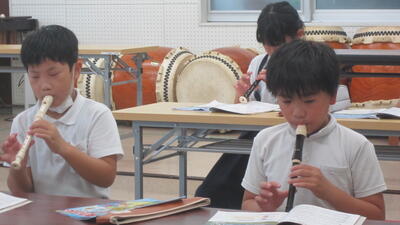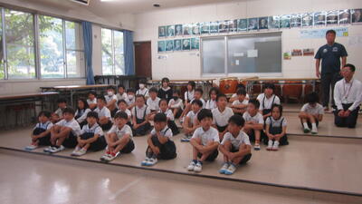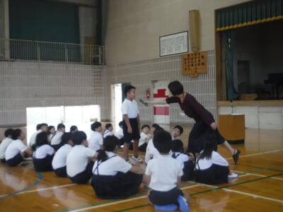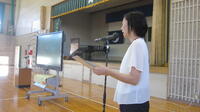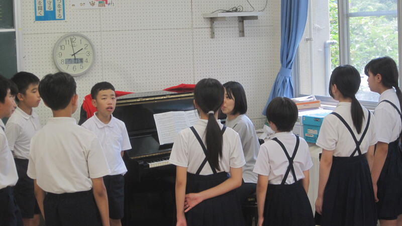 昨日は、全校体育の他、全校音楽もあり、1~6年全員で歌ったり、リズム遊びをしたりして5時間目を過ごしました。寺本教諭は音楽の専門家で、ピアノ伴奏はもちろん、声楽指導も本格的です。田中教諭も音楽をたしなまれており、田中教諭の子どもさんも本格的な歌声を磨いていらっしゃいます。まずは発声練習から。