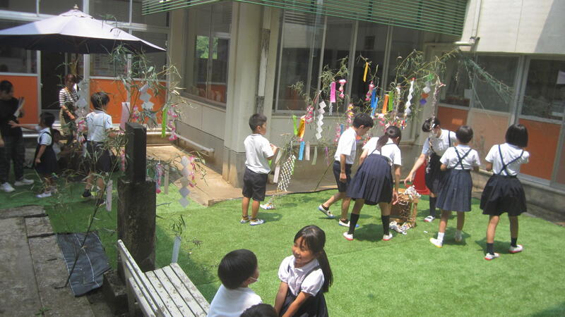 昼休みに中庭には大勢の児童が集まり、2枚目、3枚目と短冊に願いを書いてせっせと飾っていました。