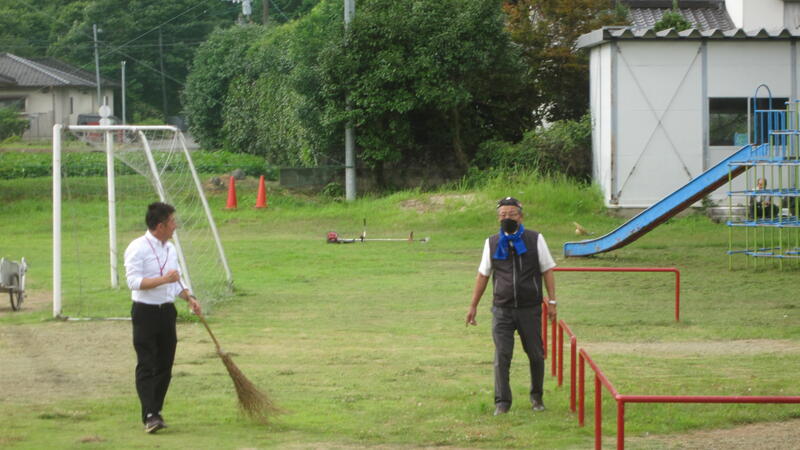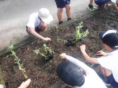 また、数週間前に1~3年生が植えた芋苗が、4割ほどしっかり植わることができずに枯れていたため、先週末(日曜日)に、地域学校協働活動推進委員の内田さんと西村さんが、古庄さんから苗をもう一度いただきまして、植え直しをしていただきました。