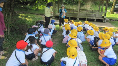 稲刈りをした後の田に水を張り、地下水を涵養していることや矢護川の水源である諏訪神社など詳しく説明してくださり、メモをがんばる4年生。山道をたくさん歩き、疲れてきたのか、何人かは水を触ったり、景色を見たり、蛙に大騒ぎ!(見つけたのは稲尾教諭でしたが・・・)