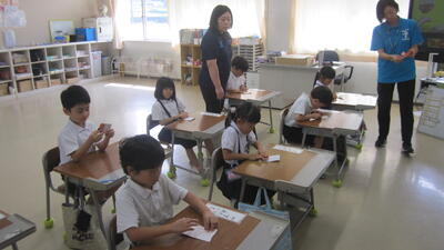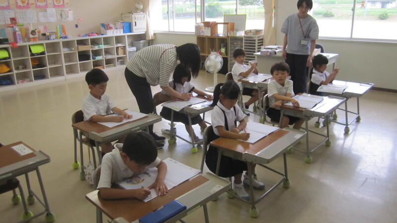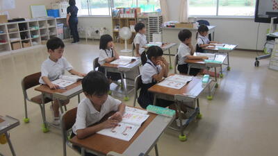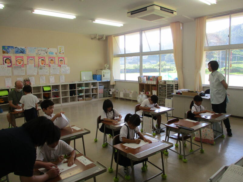 1年生、書写の時間です。大きく、はっきり、濃く、「とめ、はね、はらい」に気を付けて書きます。全集中!