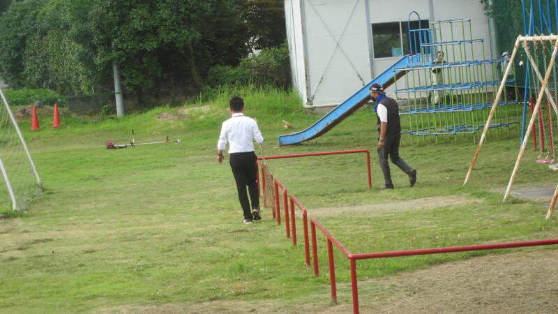 図書室から運動場を見ていたら、東側の中庭っぽいところのプランターの陰に4年生のけいたさんが隠れていました!(窓越しに写真を撮ったので、私の名札が反射して「玲子」と写っていますが・・・)