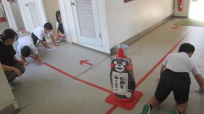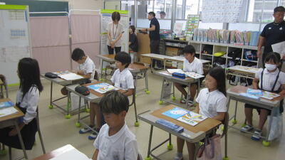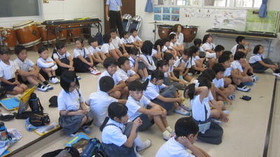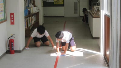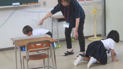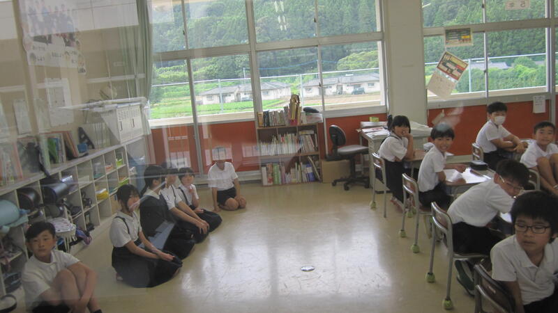 教室にいた児童、廊下にいた児童、教室を移動していた児童と様々でしたが、それぞれが放送を聞いて、落ち着いて避難訓練ができていました。