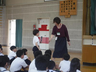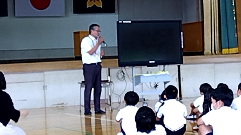 本日の児童集会は、新しくきた先生の話で私(校長)の出番でした。