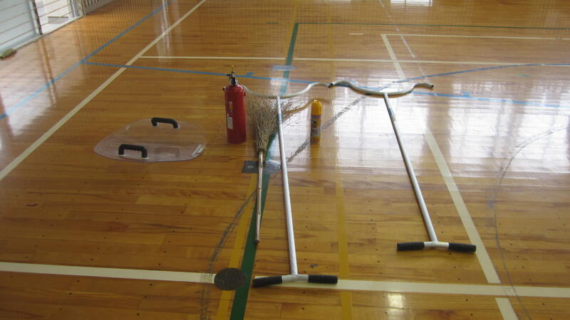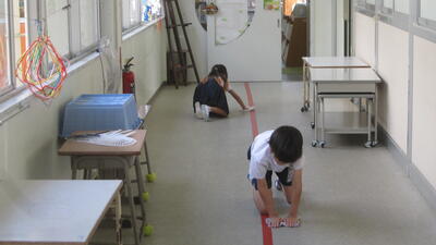 ライン鬼ごっこは、フロアのラインテープ上のみを移動する鬼ごっこです。ライン上を素早く移動していました。