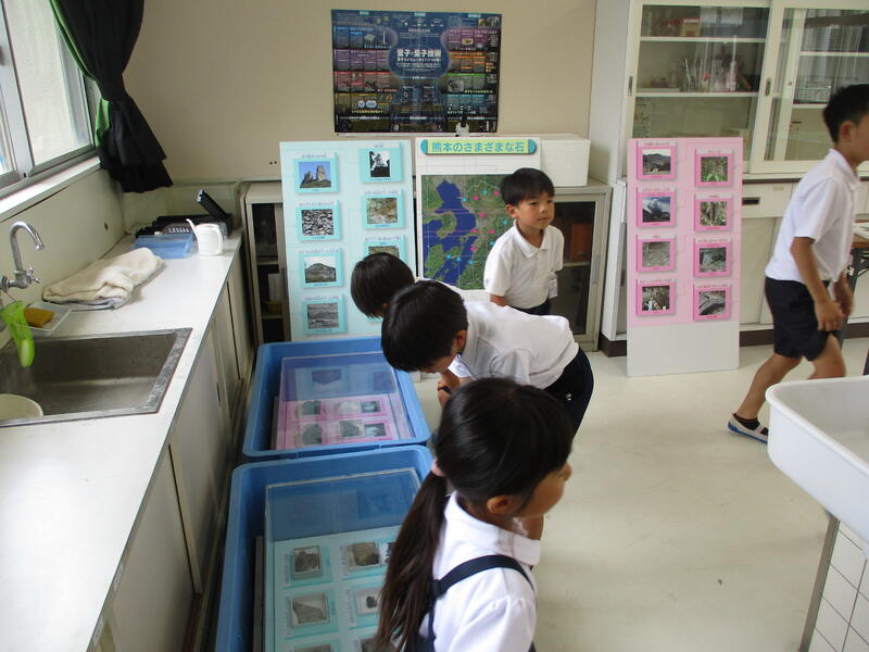 化石や岩石、昆虫の標本、草花の写真、パネルなどを展示しています。10日(木)の昼休みは、低学年も興味津々に理科室を訪れていました。