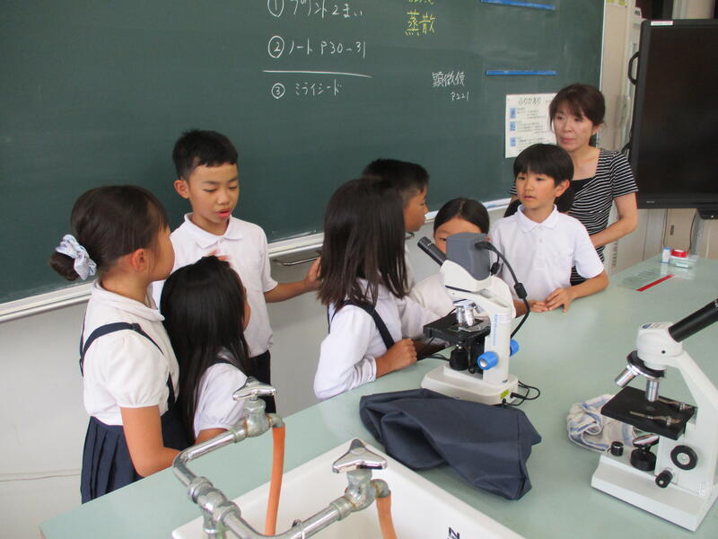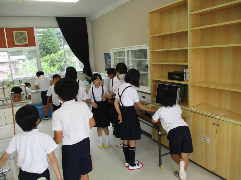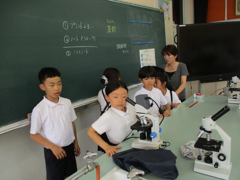 理科室前方にホウセンカの葉の「気孔」を見るための顕微鏡をセットしたままにしていました。顕微鏡が珍しく、低学年の子供たちが「何?何が見えるの?」と観察していました。6年生になったら学習します。植物の体にいきわたった水は主に葉から水蒸気として出ていきます。「蒸散」です。数年先の予習になりました。