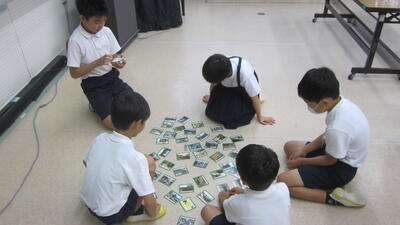 今日は朝からポツポツと雨模様。たてわり班遊びではドッジボールや長縄・かくれおに・だるまさんが転んだ等の計画だったのに、急遽室内遊びに変更です。カード遊びや折り紙遊びに変更していたようです。