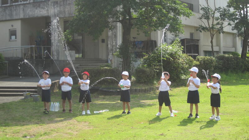 消防署の方の話の後、消火器を使う体験も行いました。訓練用で水が出るものです。「火事だ!」と大きな声で叫んでから、消火訓練をしました。