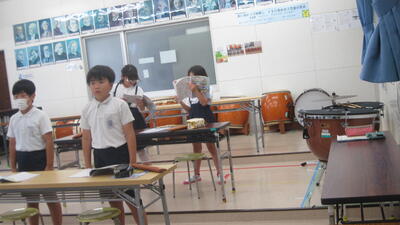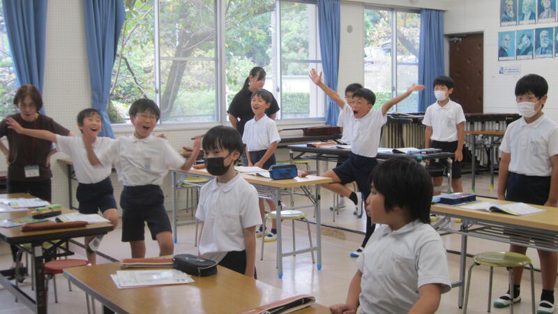 5・6年は音楽の時間。発声練習に熱が入る音楽専門の寺本先生と口と目を開けなんとかきれいな声を出そうとする5・6年生。おなかから声を出すことって難しいのです。つい、地声になって喉を痛めていた私。未だに勢いで歌う癖があります。声も楽器なんですよね。まじめにやり続ければ、美しい声になるはず!!(校長 上田 玲子)