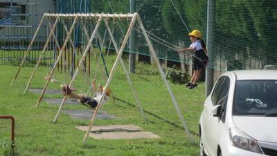 お昼は護川小の子どもたちと混ぜ混ぜでお弁当タイム。食べた後は一緒に遊んで派手につこけてしまった子どももいたそうですが、たくましく手当てした後も元気よく過ごしていたそうです。