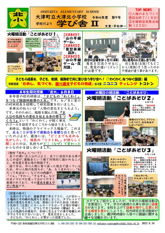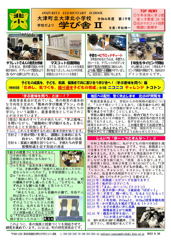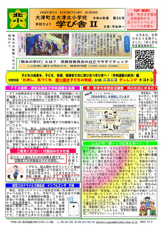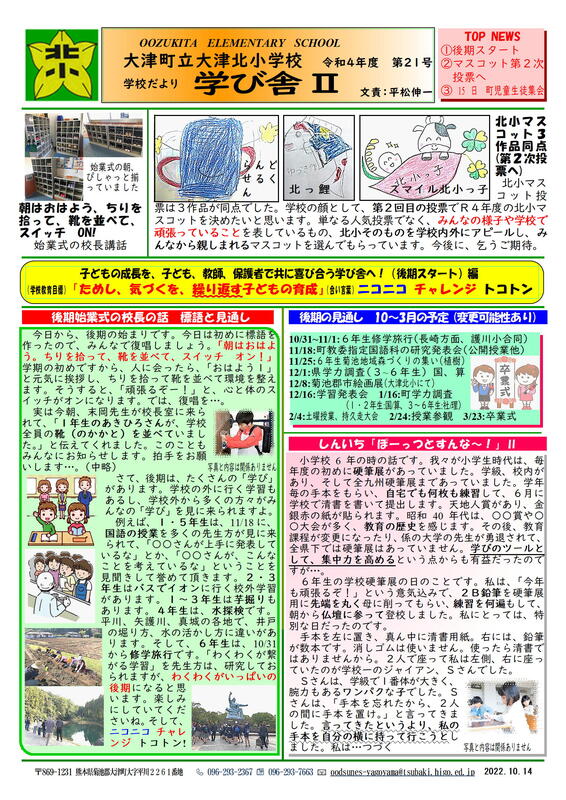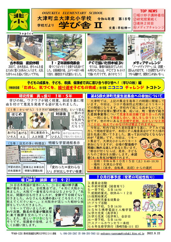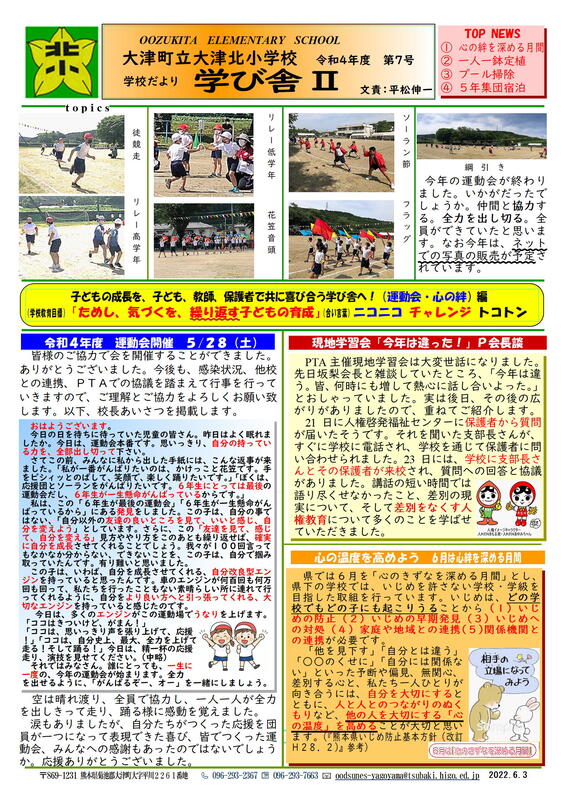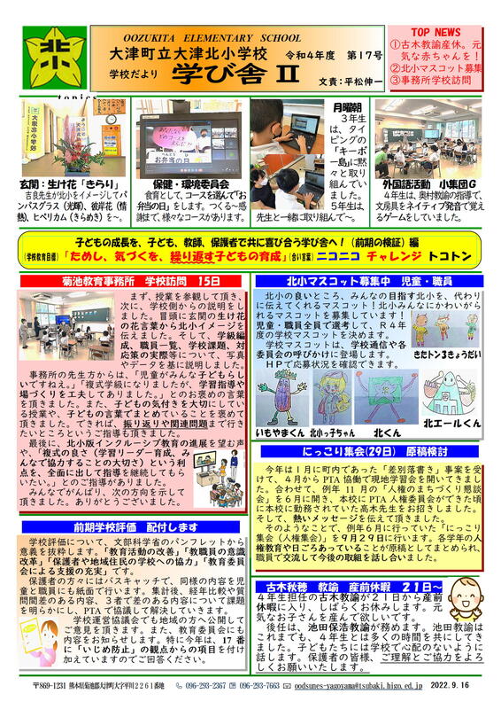令和4年度の、大津町立大津北小学校学校通信第1号を発刊しました。