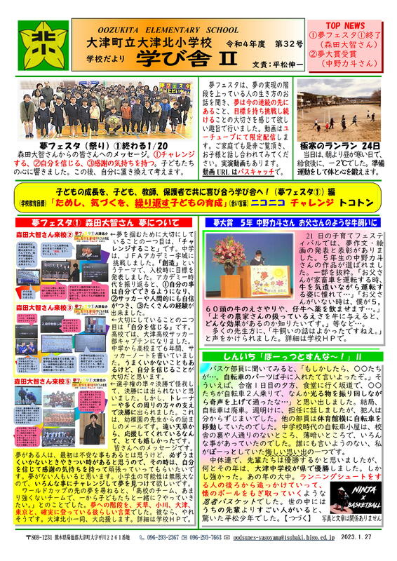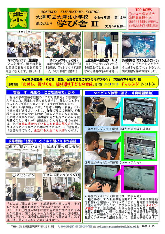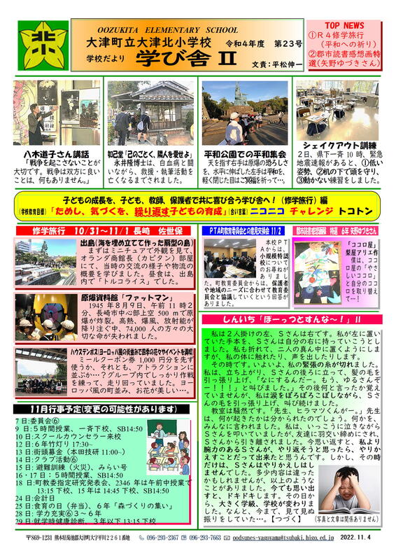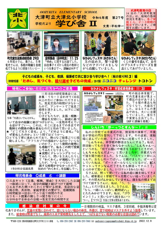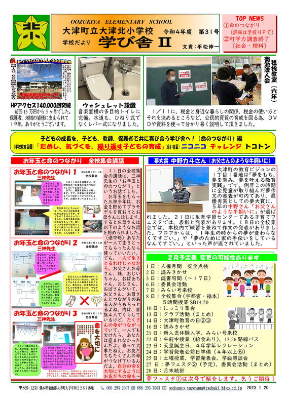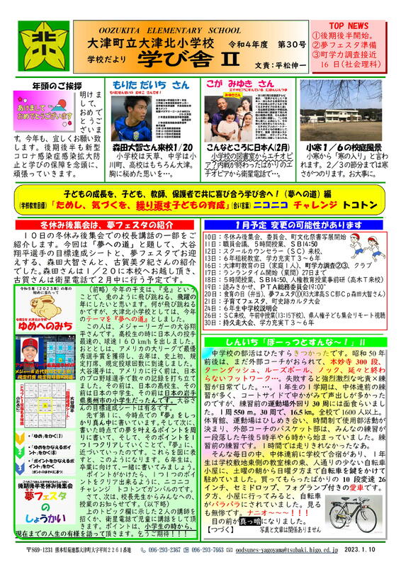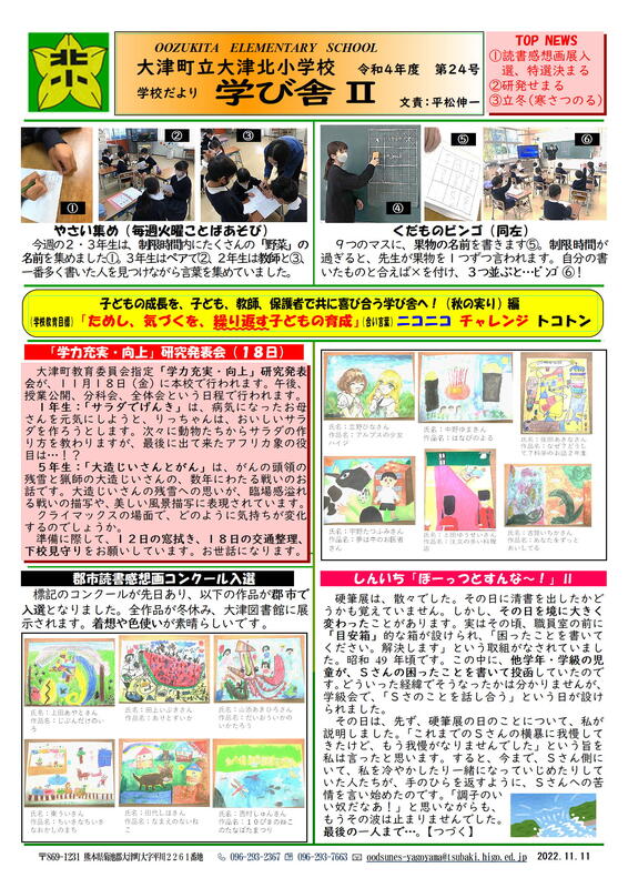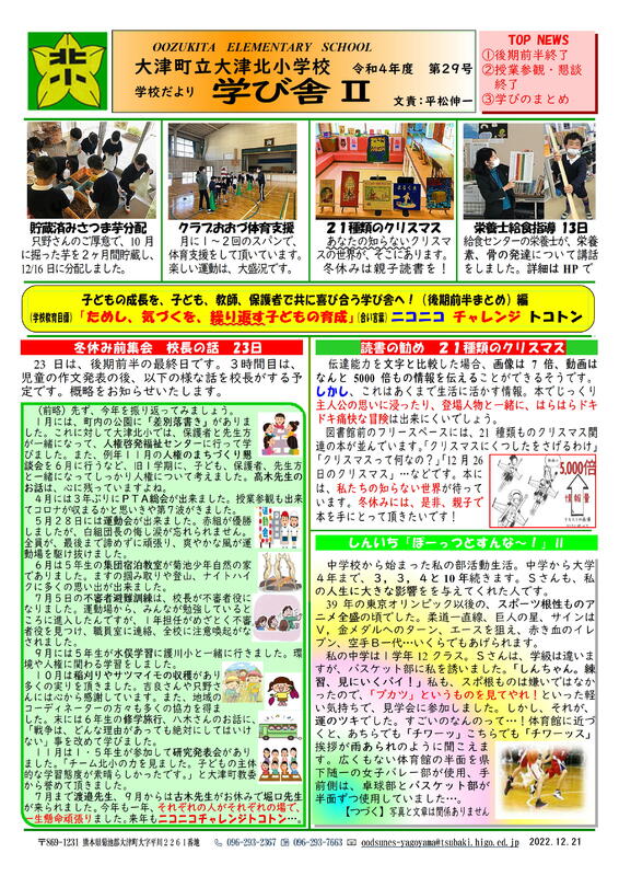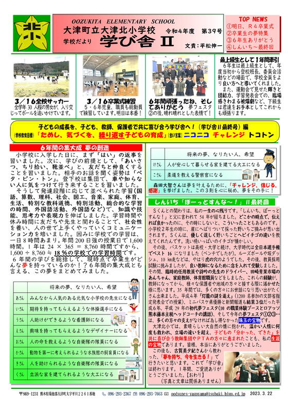 1年間ご愛読、ありがとうございました。本号を持って、学び舎Ⅱ終巻です。コロナ禍にありながら、子どもや保護者の皆様、地域の皆様方に支えられて最終号まで発刊できました。