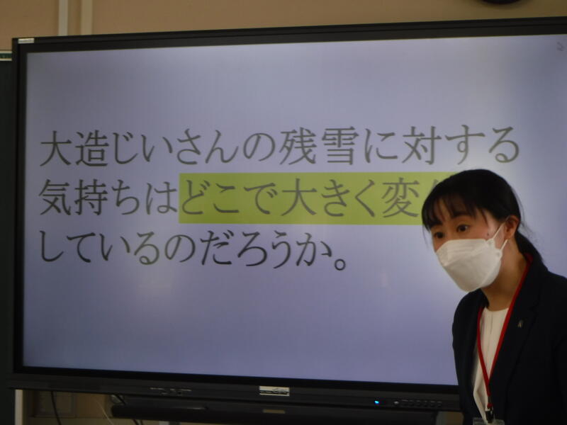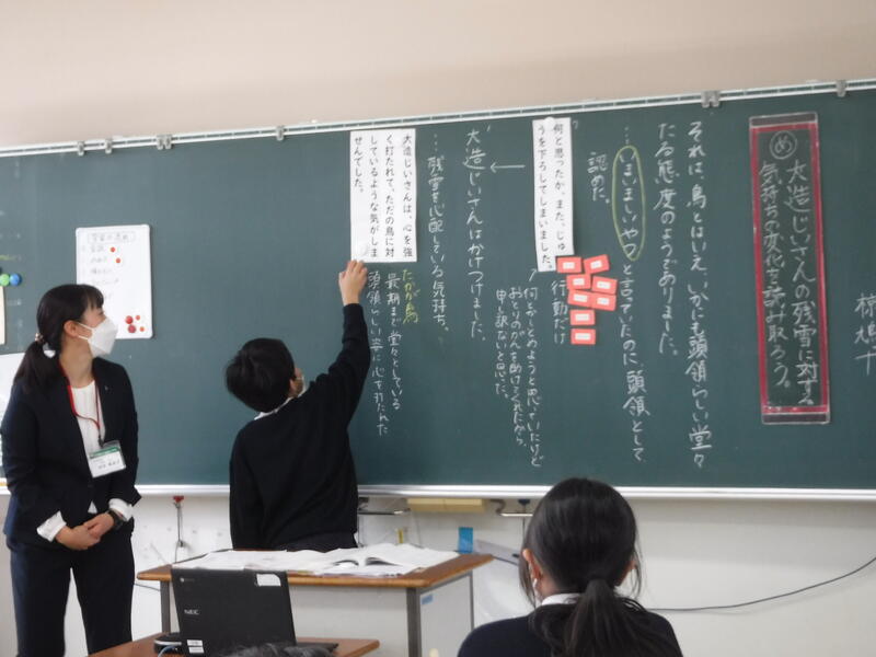 「大造じいさんの残雪に対する気持ちが大きく変わったのはどこから…」という発問で、児童は(主張)「ここからです。」それは、(根拠)「前は、〇〇と書いてあるけど、ここからは□□と書いてあります。」それは(理由)「私だって、こんな時は△△と思うし、大造じいさんだってそう思うと思ったからです。」と、3点セットを使って自分の考えを述べていました。後半、教師の追発問で焦点化されて、2箇所にしぼった話合いが進んでいました。