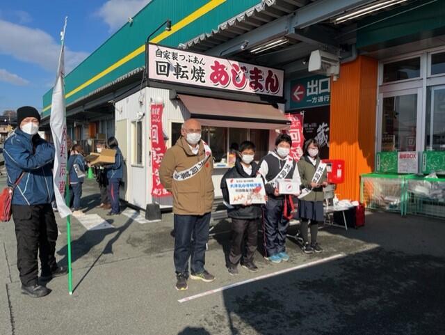 児童会執行部の3人、永田琉士さん、矢野瑶月さん、中野力斗さんが、12月25日の日曜日に、ヒロセ前で「歳末 赤い羽根募金」の呼びかけに参加しました。