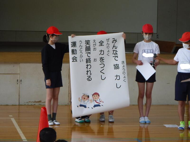 ゴールデンウィークも終わり、学校ではいよいよ本格的に運動会の練習が始まりました。5月10日(水)は結団式でした。6年生の9人が、全校児童をリードしてくれています。5年生の執行部3人もしっかり支えてくれています。