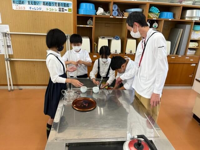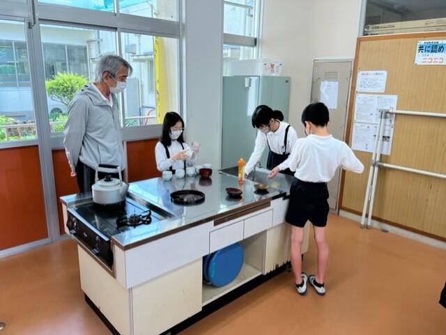 5年生は家庭科「自分にできそうな家庭の仕事を見つけよう」という学習で、お茶でおもてなしをするためにガスコンロの使い方や食器の洗い方、片付け方を勉強したのです。