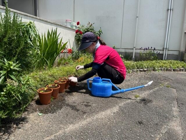3年生理科では、ホウセンカを育てます。外では、日差しが厳しい中、大田黒先生が発芽したホウセンカを、見本用に植木鉢に植えかえてくださっていました。