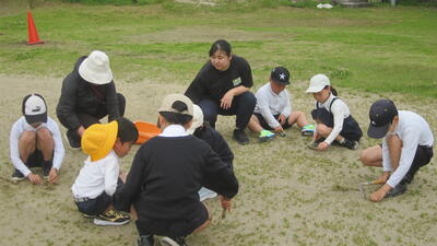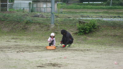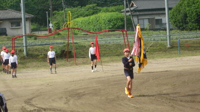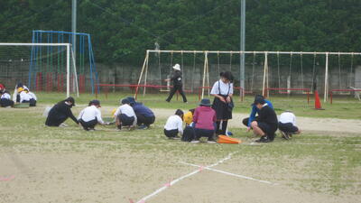 5月25日(日)には雨が上がり、グラウンドにたまっていた水たまりを地域の岩元さんと職員と保護者の嶋村さんとでスポンジやスコップで吸い出したりすくい出したりした後、乾いた砂入れを行い、順延でしたが、なんとか予定通りに運動会の開会式をむかえることができました。