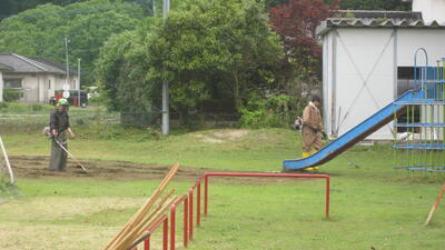 5月11日(日)は運動会前の本校の愛校作業でした。多くの保護者・児童と地域の方に参加いただき、草刈り、草取り、テント立て、入場門の支柱確認など約1時間半ほどご協力いただき、美しい運動場にしていただきました。