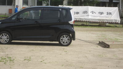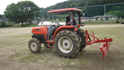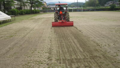 仕上げに地域の岩元さん(毎週本校のグラウンドでグラウンドゴルフと運動場整備をしていただいてます)がマイカーでグラウンド整備をしてくださり、それでも取れなかった雑草を保護者の方が道路整備用の車両で整地してくださいました。