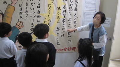これまで、被害を受けてきた差別落書きやそれに対する思いなどを写真や綴りを元にお話しくださいました。子どもたちは、「悲しい、こわい、落書きされたらいやな気持ちになる、ひどい言葉、なんでするんだろう」など様々なことを思い、つぶやいていました。