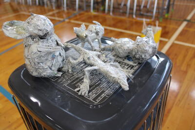 この写真は、東耕平さんの作品の一つです。本日は、PTA役員の只野さんの紹介で、「彫刻家 東耕平さん」を招いての新聞アート体験を全児童で実施しました。
