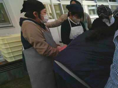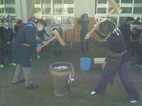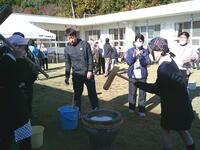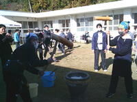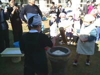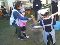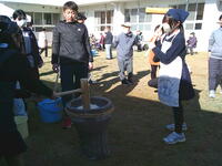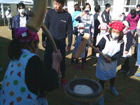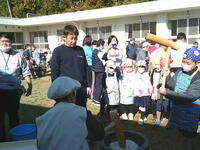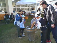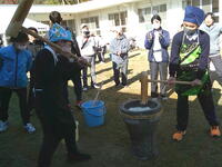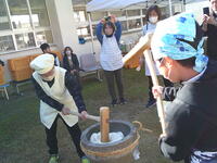 いつもよくしていただいているつくしの里の施設長の松永さんを始め、全職員の方々と入所者の方々の熱い歓迎を受け、餅つきが始まりました。「クールポコ」のものまねに扮した職員の方々の余興に失笑する小学生と私たち…。この参加者を楽しませようとしてくださる優しさと度胸は、子どもたちも見習ってほしいものです。本当にいつもありがとうございます。