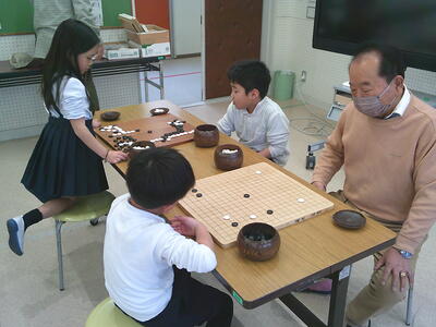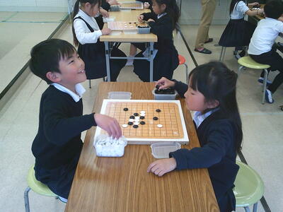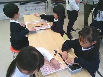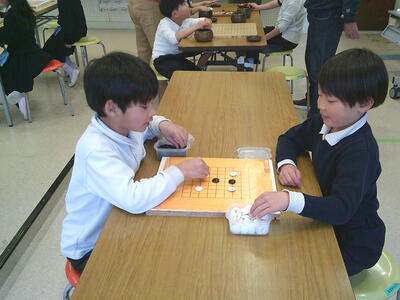 始めは自分が勝つことだけに全集中だった子どもたちが、友達に勝たせてあげながら、碁石の置き方を教えているところもよく見られるようになりました。「全体を俯瞰しながら戦略する」視野の広さも学んだ1年間でした。