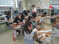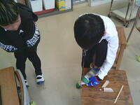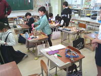 下に降りたら。1~2年生は教室におらず・・・。体育かな?3年生は図工で工作中でした。