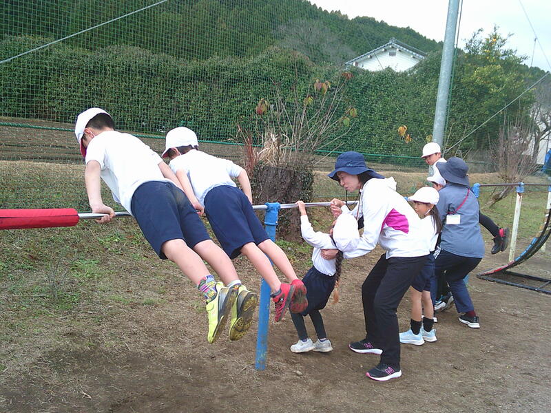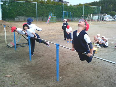 ふと、運動場を見ると、1~2年生が体育で縄跳びと鉄棒をがんばっていました。