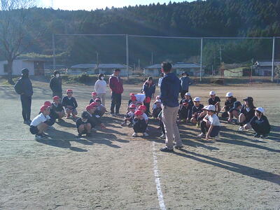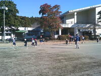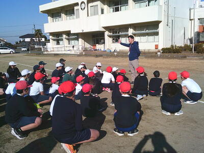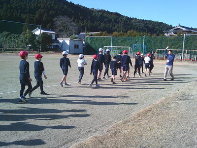 合同体育で、まずは運動場周回コースを5分間、全児童が走ってみました。