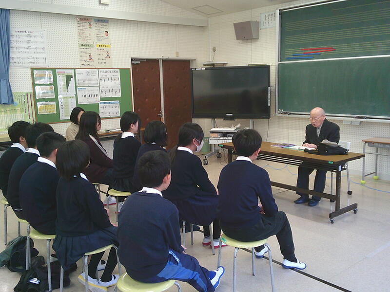 本日は、熊本市東区にお住まいの小平さん(前は大津町在住で地域の丸付けボランティア等をされていたこともある)に来校していただきまして、5~6年生が戦争体験の講話を聴くことができました。
