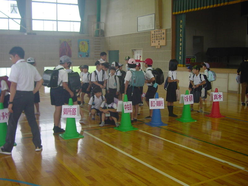 訓練開始の放送で、児童は体育館に集合。地区別に整列。