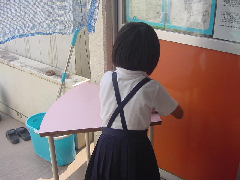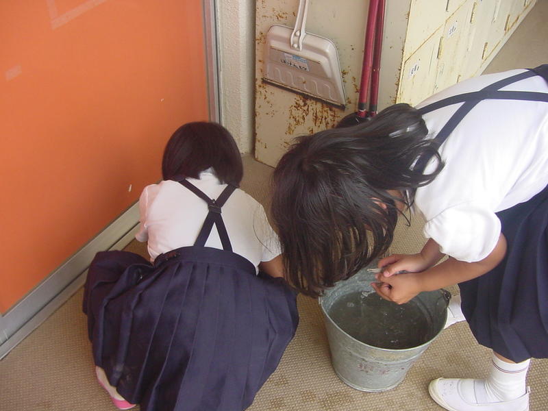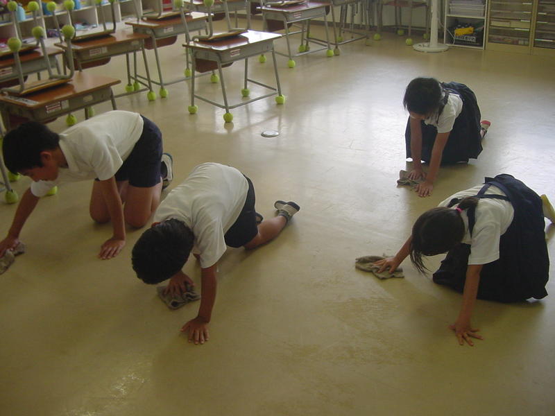 1年生も教室やろうかなどをきれいにしています。雑巾を洗って絞るのも上手になりました。6年生がお手伝いに来てくれています。