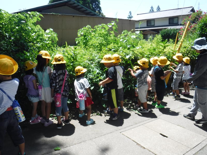 学校に帰って、みんなで笹舟を作りましたよ。鯉のいる池に浮かべてみました。