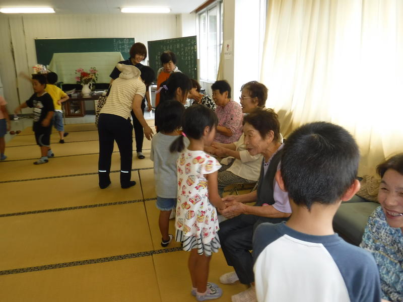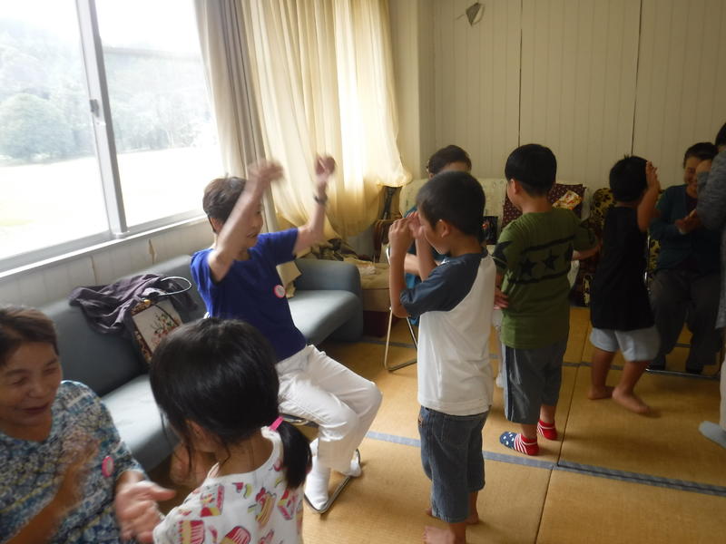 9月11日は真木方面に出かけました。真城小学校の体育館でおじいちゃん、おばあちゃんと一緒にゲームをしたり、出し物をしたりしました。おちゃらかほいをしました。一緒にソーラン節も踊りました。楽しかったです。