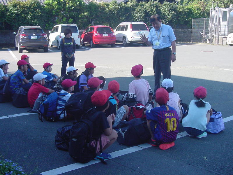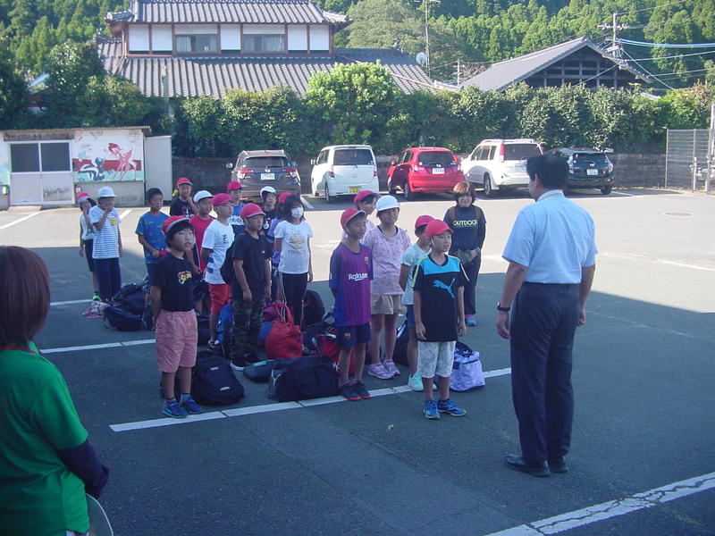 今朝、八時前に出発式が行われ、無事にバスで出かけました。