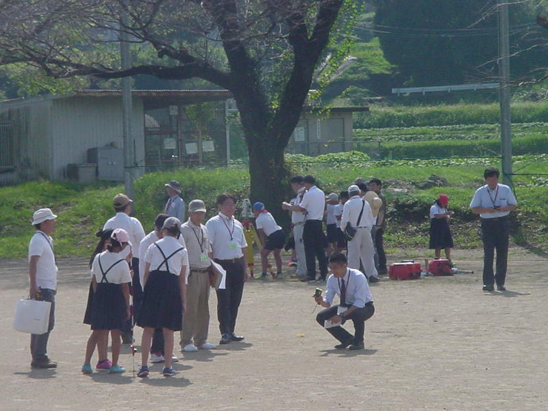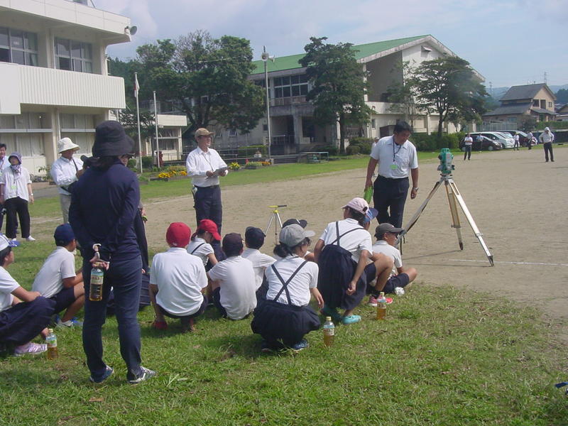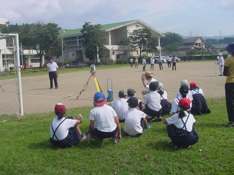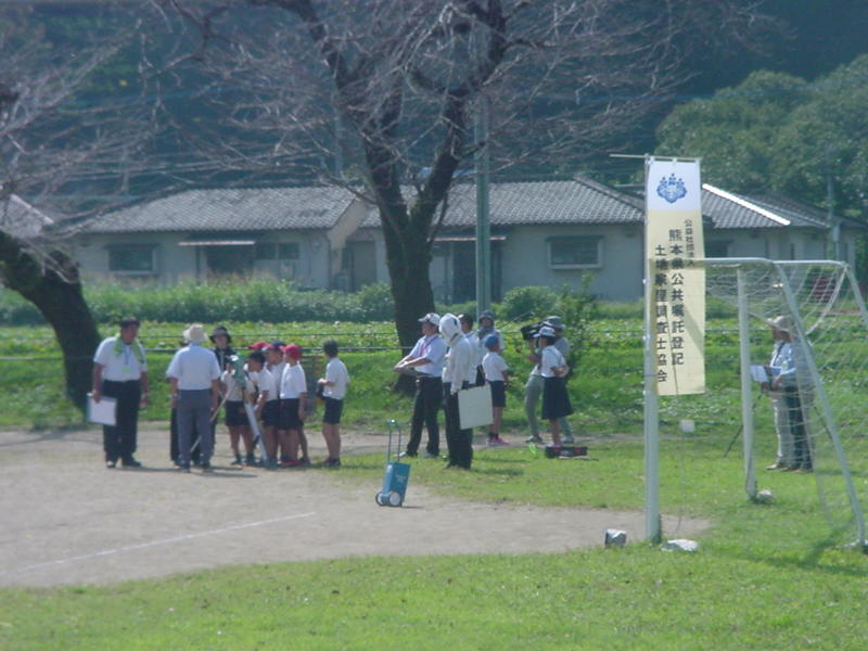 9月30日(月)に5年生と6年生が測量体験学習をしました。公共社団法人熊本県公共嘱託登記土地家屋調査士協会の皆様がたくさん来校され、子どもたちと運動場で活動してくださいました。