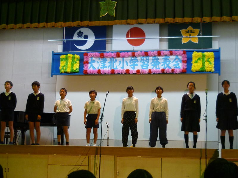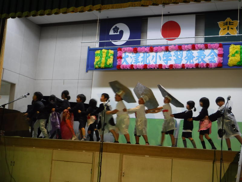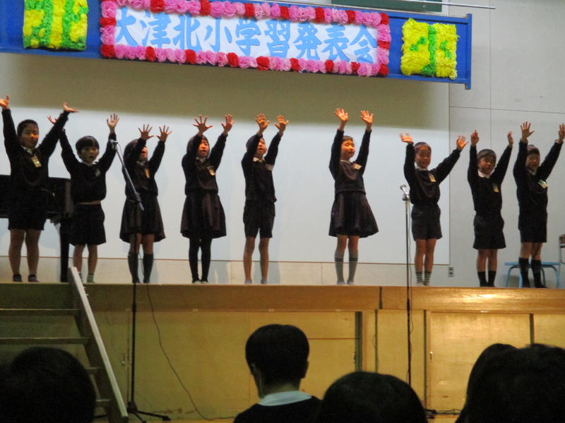 4年生は総合的な学習の時間に、大津北小校区の水について学習してきました。調べていくと、真木・矢護川・平川それぞれの地域では、水を手に入れるために、私たちの先祖は知恵や力を出し合ってきたことが分かりました。学習したことをテレビ番組形式で発表しました。先日の町の音楽会で発表した「北小豊年太鼓」も披露しました。