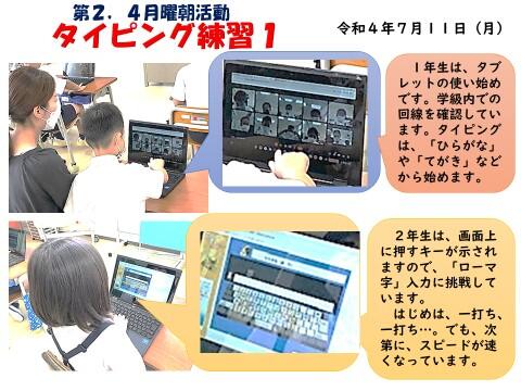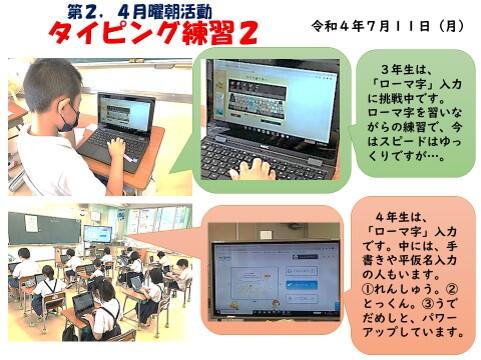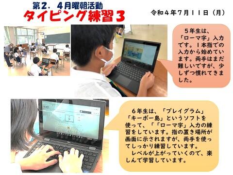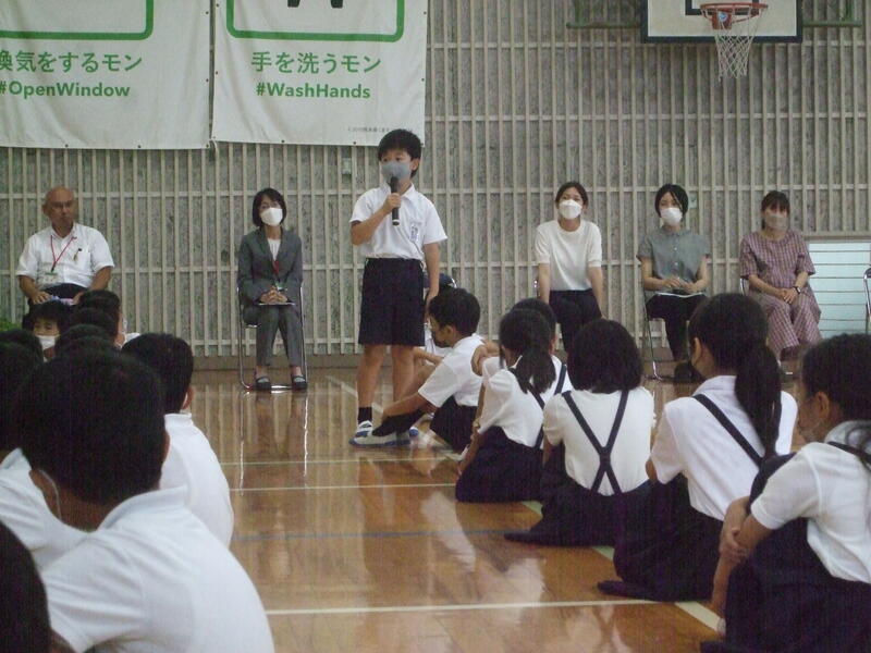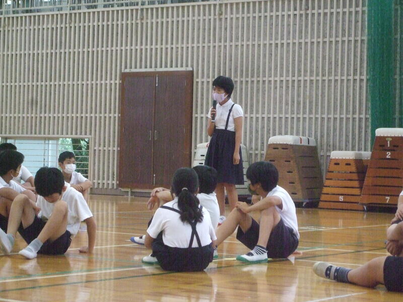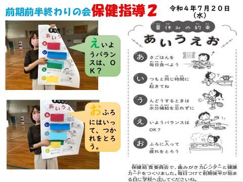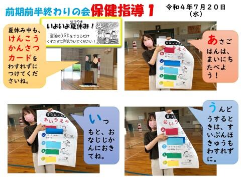 7月20日、前期前半終わりの会で、大塚養護教諭が全校児童に向けて保健指導をしました。「あいうえお」を頭文字に使って、分かりやすい内容でした。子どもさんとも、一緒にHPを見て、話し合われてはどうでしょうか。