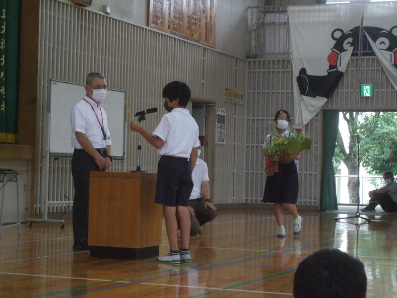 最後に、5年生担任の渡邉道信先生の退任の挨拶がありました。渡邉先生は、7月末で退任になります。5年生の古庄湊祐さんの心のこもった感謝の作文、古庄茉愛さんから、大きな花束の贈呈がありました。