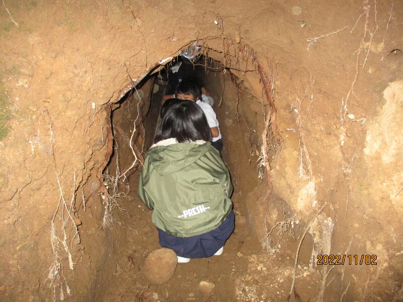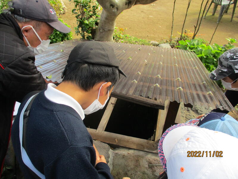 井戸は縦方向に掘るものと思われていますが、場所によっては横方向に掘って水脈を探したそうです。横穴の入り口からのぞき込んで、暗い中の方にちょっとだけ入っていきました。本当の探検のようでした。まだ水道が整備されていなかった時代には、ここから出てくる大切な水を現在の大津北小学校に向けて道に穴を掘り、パイプで送って、当時の子どもたちが使っていたそうです。
