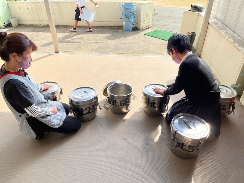 修学旅行から帰ってきたばかりの6年生が、早速、全校の給食の後片付けをしています。