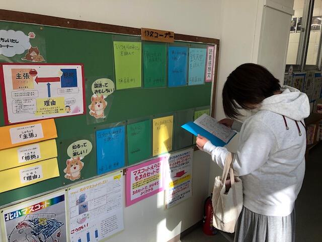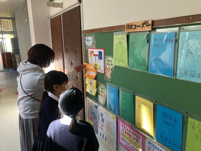音楽室前の国語コーナーです。3点セットの主張の「見え隠し」を開いておられました。