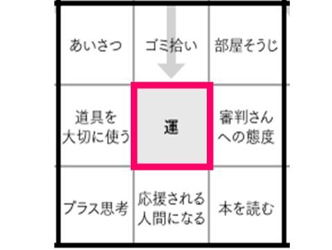 今日皆さんにお話ししたいのは、「運」というポイントの周りに、「あいさつ」「ゴミ拾い」「部屋そうじ」「審判さんへの態度」「本を読む」「応援される人間になる」「プラス思考」「道具を大切に使う」の8つのポイントを書いていることです。