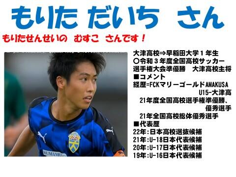 写真は、森田大智さんです。去年の大津高校サッカー部のキャプテンです。去年の今頃、全国高校サッカー選手権大会で大津高校は準優勝しました。今、東京の大学の1年生です。